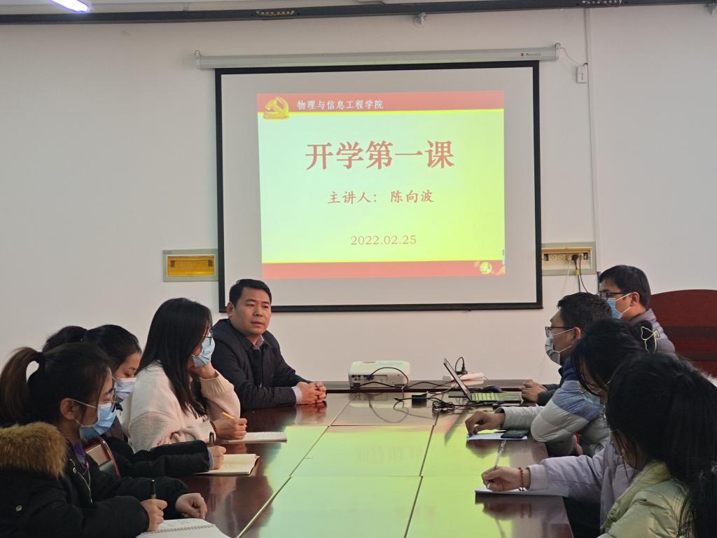 2月25日下午3:30,公司党委书记陈向波在实验楼S202会议室为物理学B支部全体党员讲授2022年春季学期“开学第一课”。会议由物理学B支部书记、物理实验室主任程留永主持。