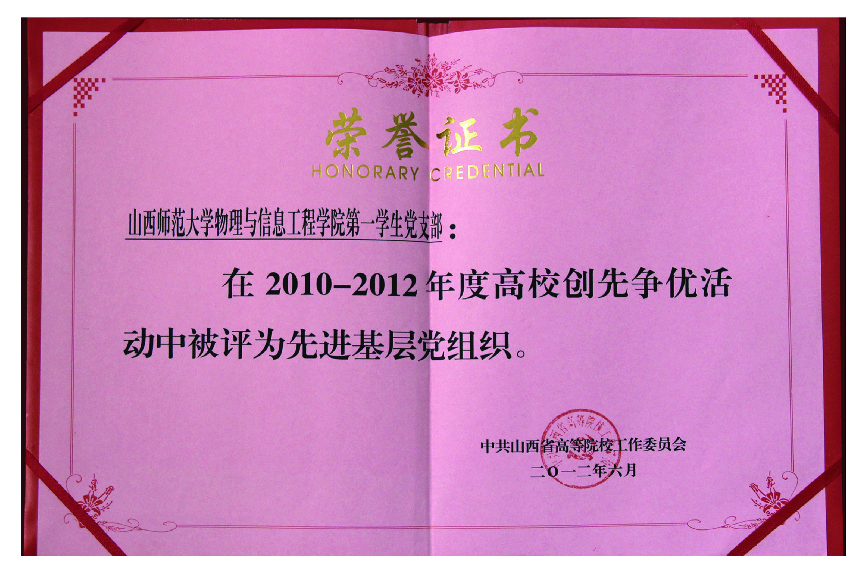 第一员工党支部在2010-2012年高校创先争优活动中被评为先进基层党组织