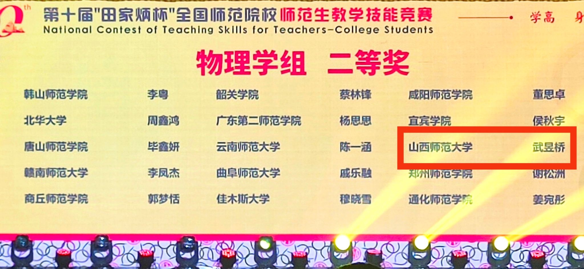 11月29日至12月1日,“田家炳杯”第十届全国师范院校师范生教学技能竞赛决赛在浙江师范大学举行。公司2201班武昱桥同学在刘亮亮、段晓峰、穆林平老师的悉心指导下,沉着冷静、发挥稳定,最终成功斩获二等奖。