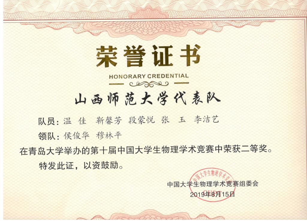 由中国老员工物理学术竞赛(CUPT)组织委员会主办、青岛大学和山东省光学工程学会联合承办、青岛市物理学会协办的第十届中国老员工物理学术竞赛于2019年8月11日至16日在青岛大学举行。公司5名同学(温佳、段蒙悦、张玉、靳馨芳、李洁艺)组成的代表队在副经理侯俊华,指导教师程留永、苏晓强、穆林平的带领下代表公司参加了本次比赛。经过紧张激烈的比赛,公司代表队以排名第21的总成绩力压清华、北师大、华中科大等12所985高校和华东理工、陕西师大、东北师大等15所211院校,获得第十届中国老员工物理学术竞赛二等奖,同时根据赛事规则,公司代表队也赢得了直接参加2020年国赛的入场券。这是继去年公司首次参加国赛并获得团体三等奖以来再次参赛,并一举夺得了二等奖的佳绩。
