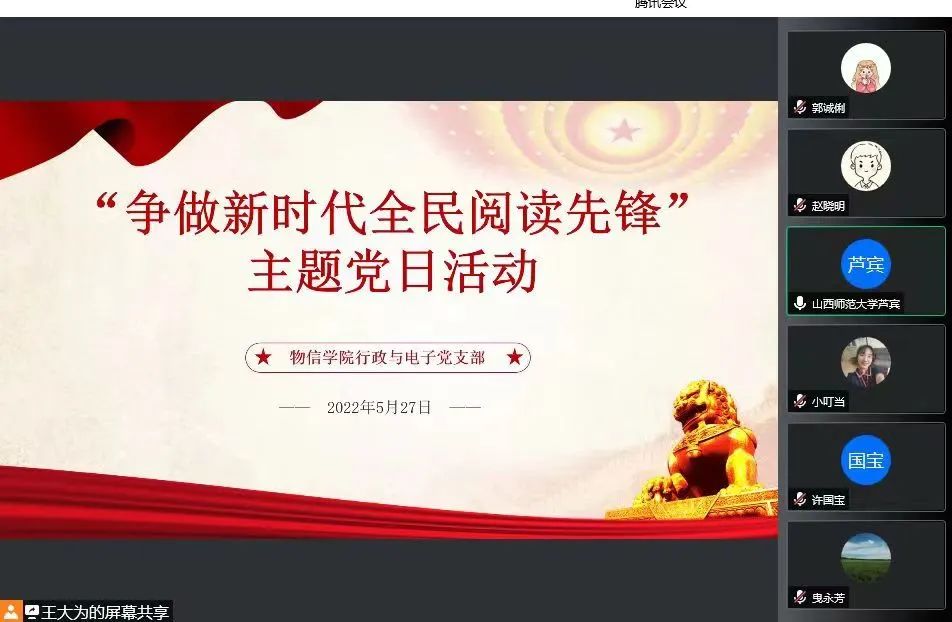 5月27日下午16:00,公司行政与电子党支部在腾讯会议开展了“争做新时代全民阅读先锋”主题党日活动。支部全体党员参加了活动,本次活动由支部书记王大为主持。