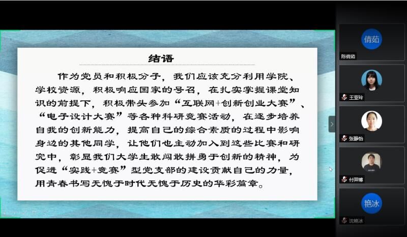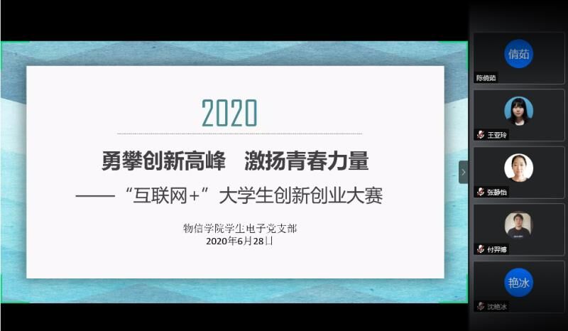 为响应国家对深化人才培养综合改革,全面推进素质教育,切实提高员工的创新精神、创业意识和创新创业能力的要求,6月28日下午,公司员工电子党支部线上开展了“勇攀创新高峰,激扬青春力量——‘互联网+’老员工创新创业大赛”主题党日活动。支部书记卫永霞及支部全体党员和入党积极分子参加了此次活动,活动由支部党员韩凯琦主持。