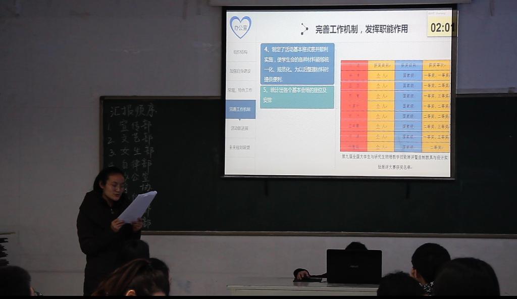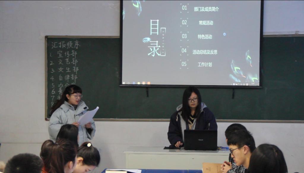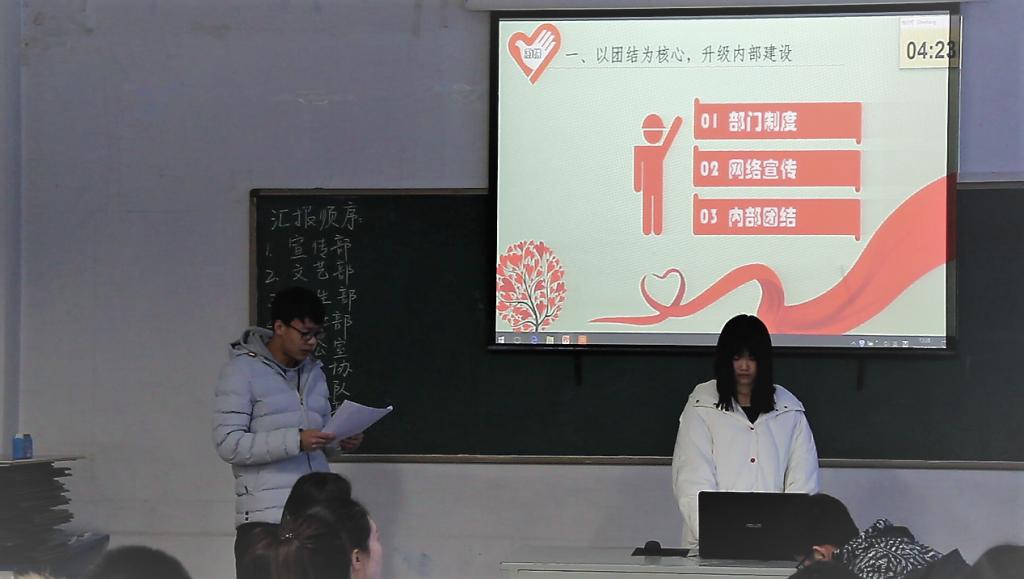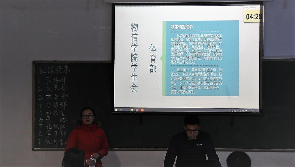 员工会主席韩超介绍工作汇报要点后,员工会九个部门部长轮流发言。每一位代表以PPT的形式向大家展示了举办的活动和取得成绩。一学期的辛苦努力汇集呈现, 大家真切地明白,一分耕耘一分收获,观众不时以热烈的掌声肯定他们辛勤的付出和汗水。各部部长在展示成绩后,也介绍了下学期的计划和目标,力争是更上一层楼。