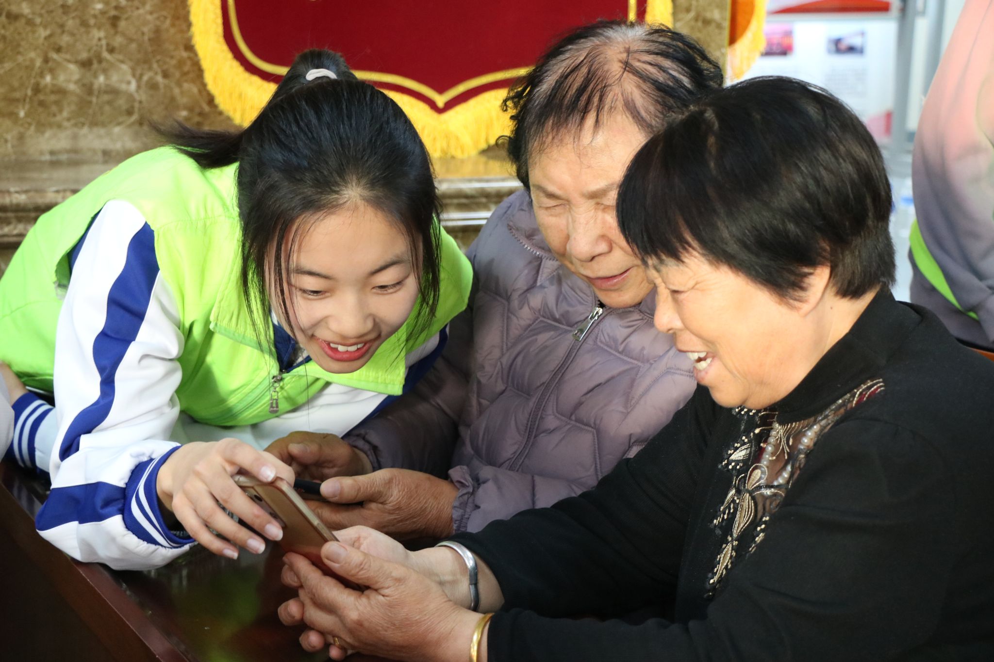活动开始,志愿者们首先为老人们讲解如何使用智能手机,每位同学都细心地帮助各位老人了解关于智能手机的功能,并进行了一对一的指导。然后,同学们热情饱满地上台为老人们表演节目,并带领老人们一起做了养生操,为老人们带来欢乐的同时,也拉近了彼此之间的距离。随后,同学们和老人们一同进行了趣味小游戏,全场洋溢着大家的欢声笑语。最后,活动在一首合唱歌曲《我和我的祖国》中落下帷幕。