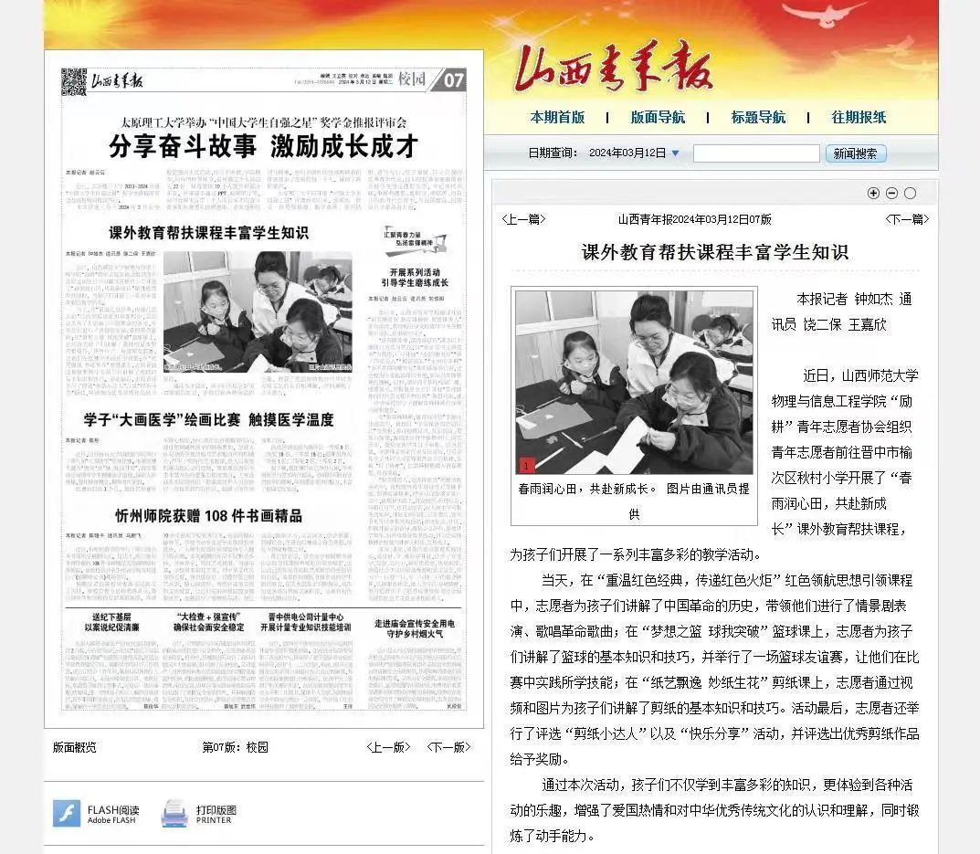 《山西青年报》报道公司“励耕”青协“春雨润心田,共赴新成长”教育帮扶实践活动