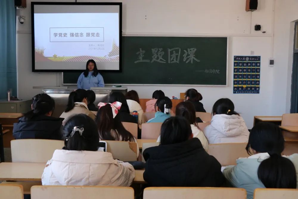 为引导广老员工厚植爱党、爱国、爱社会主义的情感,树立远大理想,12月2日,院团委在南区三号楼3304教室开展了“学党史 强信念 跟党走”主题团课活动。院团委各部门负责人以及各班团支书参加了此次活动。本次活动由2004班团支书郭龙女主持。