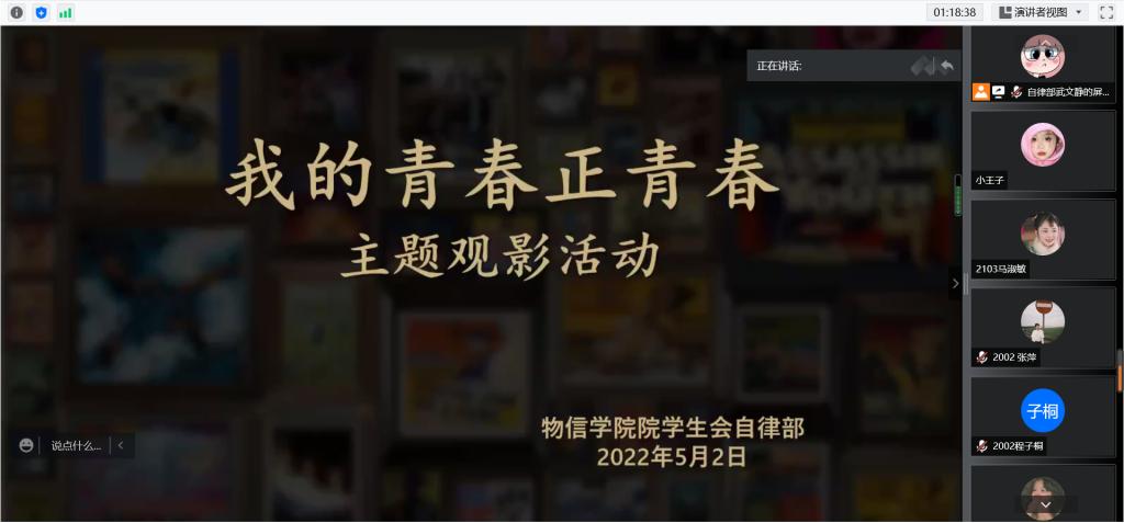 在五四青年节到来之际,为继承和发扬伟大五四精神,5月2日下午,院员工会自律部在线上举办了“我的青春正青春”主题观影活动。活动由自律部志愿者武文静主持。