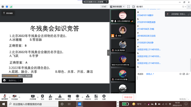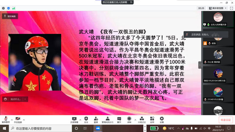 活动中,与会人员共同观看了冬残奥会宣传片《致敬自强奋斗的你》,深刻感受到了运动员们愈挫愈坚、绝不言败的斗争精神。霍鑫杰为大家详细介绍了冬残奥会的历届赛事、相关历史和2022北京冬残奥会的场馆建设和部分赛事项目。在交流讨论环节,大家积极发言,分享了自己所知道的一些运动员们鼓舞人心的故事。同学们纷纷表示,自强、自立、自信、拼搏、向上的精神给予了自己不断突破的力量,只要敢于斗争、无惧挑战、愈挫愈勇,再多的险滩也能蹚过,再大的风雨也能阻挡。(文/杨亚倩 摄/杨亚倩)
