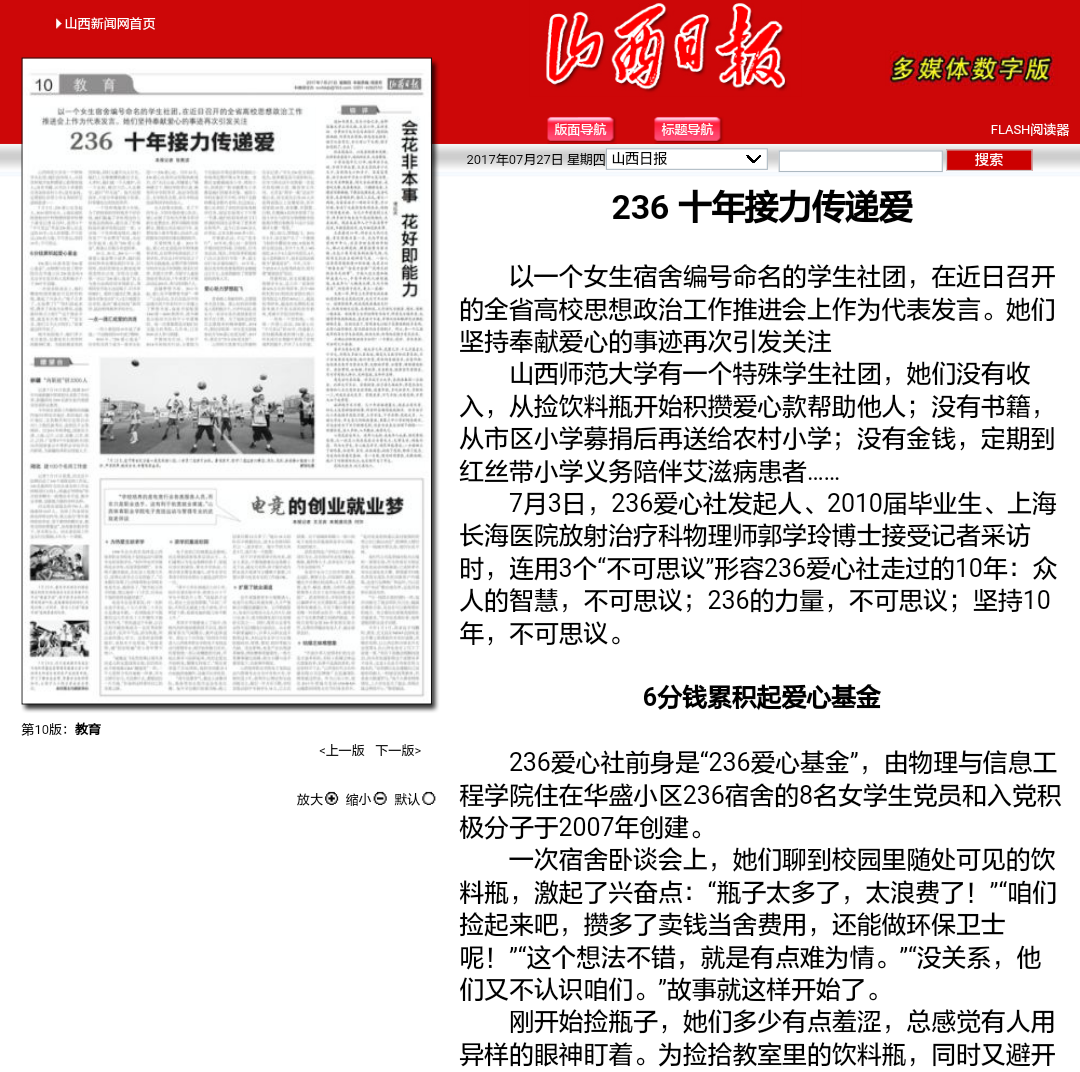 编者按:以一个女生宿舍编号命名的员工社团,一个接力爱心传递爱心的群体,他们十年坚守、十年传承的事迹再次引发社会关注。7月27日,《山西日报 • 教育版》以“236  十年接力传递爱”为题长篇报道了公司236爱心社的感人事迹。现将全文转载,传播师大好声音,传递青春正能量。