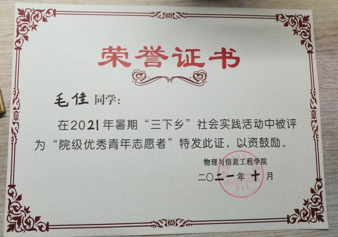 2021年暑期“三下乡”社会实践活动院级优秀青年志愿者