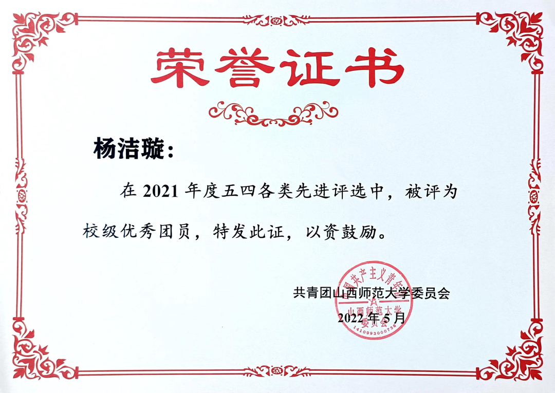 2021-2022年度,评为校级优秀团员