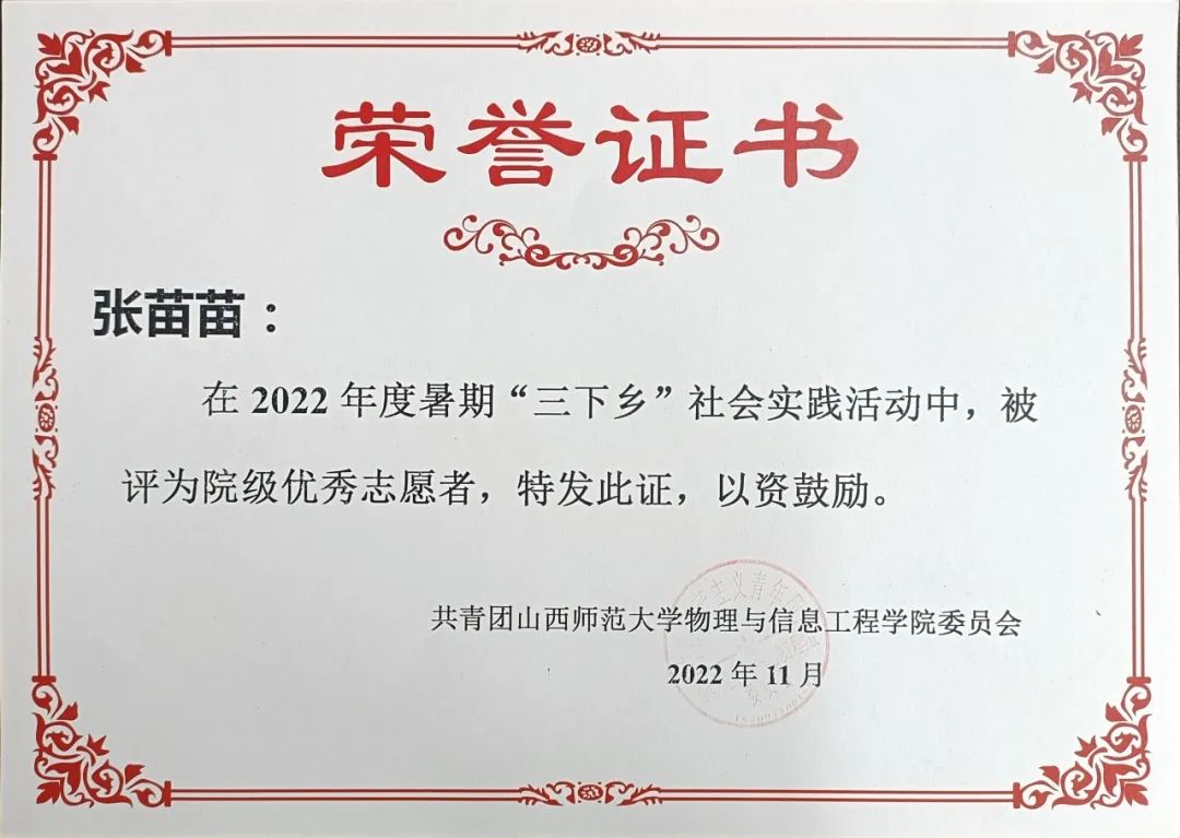 1.在2022年暑期“三下乡”社会实践活动中被评为“院级优秀青年志愿者”