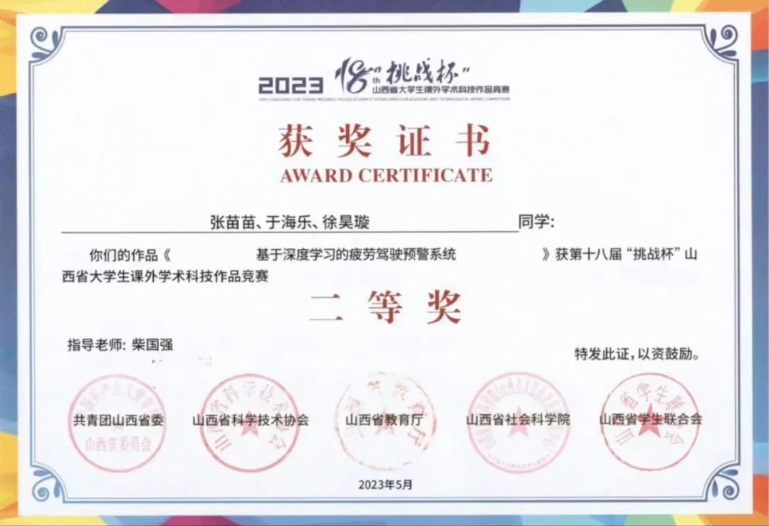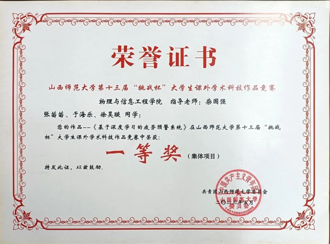 1.2022年在《电脑与电信》以第一作者发表《基于深度学习的疲劳驾驶预警系统》论文