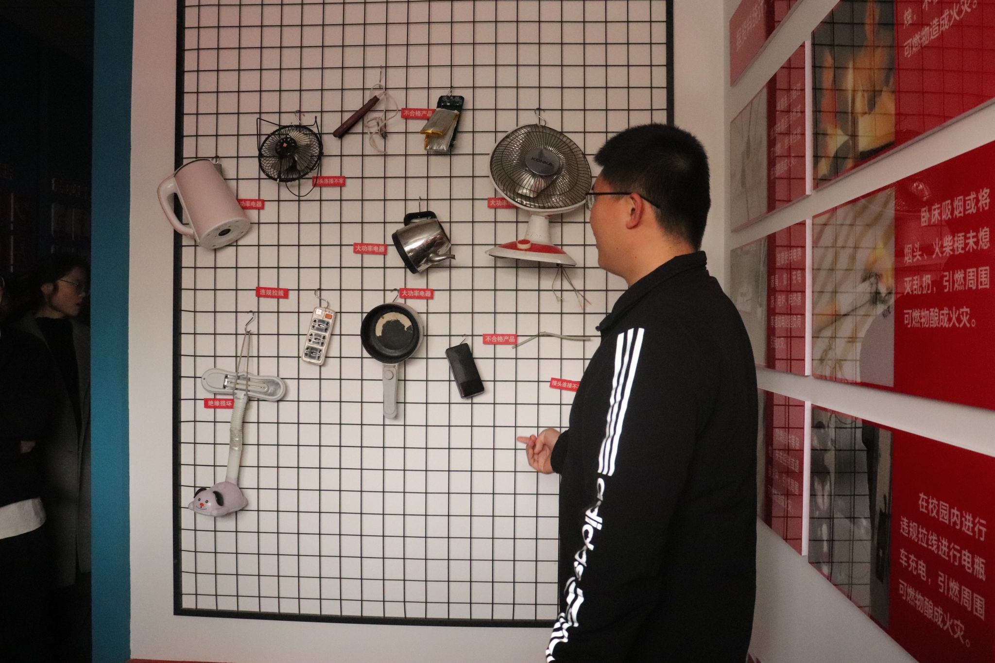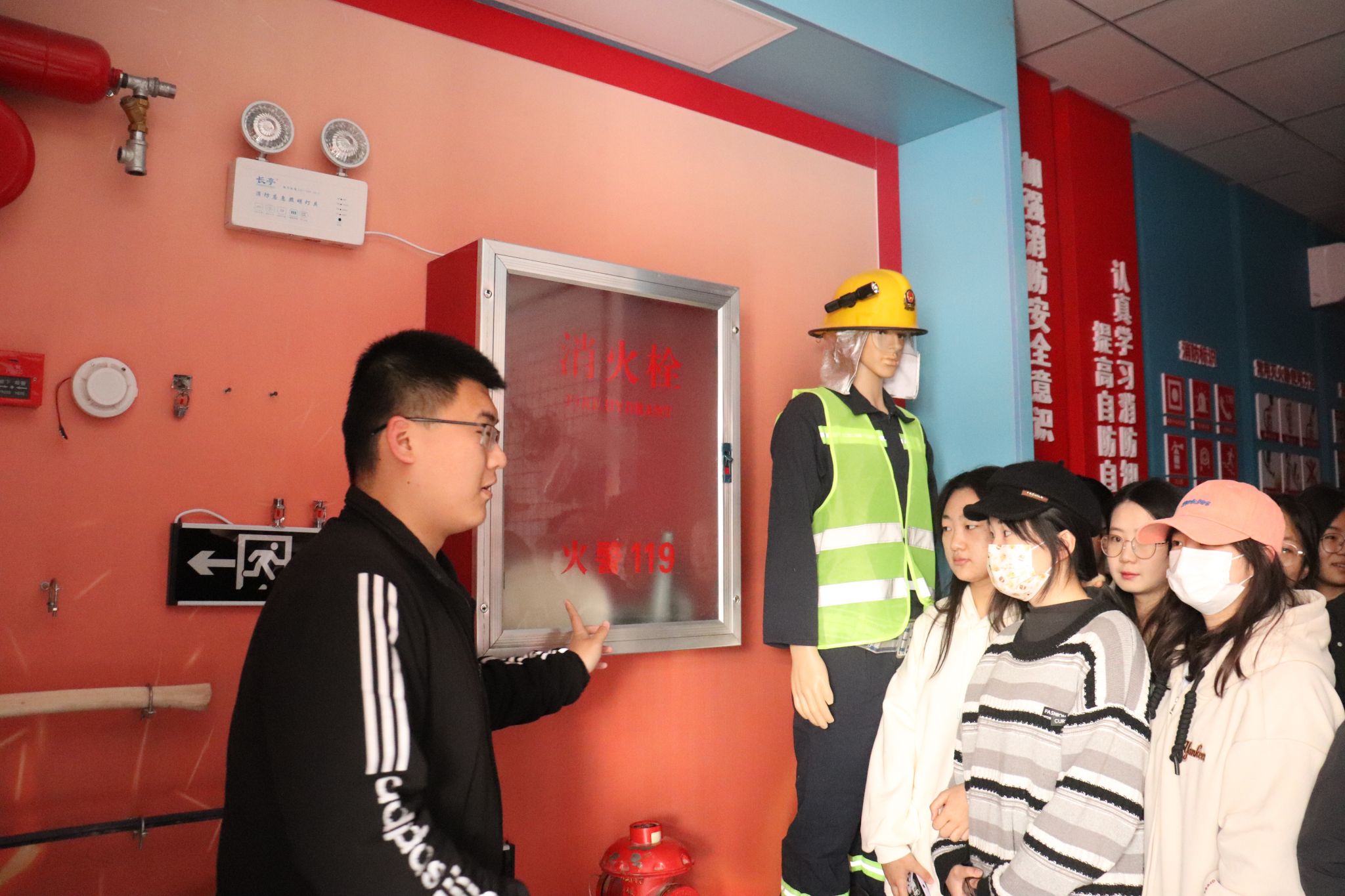 参观过程中,文江涛首先介绍了高校易发生火灾的场所和隐患点,针对存在安全隐患的违禁高功率电器的潜在风险,就日常生活中电器的正确使用方法和注意事项进行讲解。随后带领大家参观了公共场所中常见的消防设备和应急消防站,强调要熟知各类消防器材如灭火器、消防栓等的使用方法和适用对象,以及熟知各场地普遍设置的应急通道和可行有效的疏散路线。