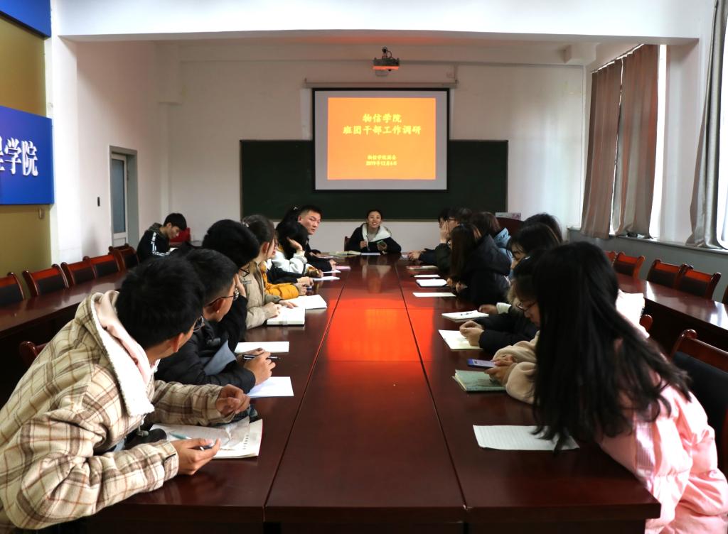 2019年12月6日下午5:00,公司团委在四号楼二层多功能会议室召开了班团干部工作调研会。公司大一大二各班班长、团支书参加了会议,会议由院团委副书记岳文慧主持。