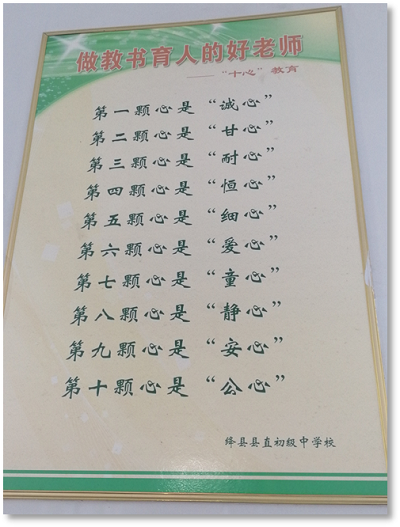批改员工的作业,无疑是很累的,脖颈酸痛,身心疲惫,但抬起头活动脖颈时看到了这样的一幅墙标。短短几天实习体验,我就对这“十心”教育却有不少体会。做一名好老师,就要以赤诚之心对待员工,倾囊相授;以甘愿奉献之心对待工作,任劳任怨;以孜孜不倦之耐心教授知识,循序善于。