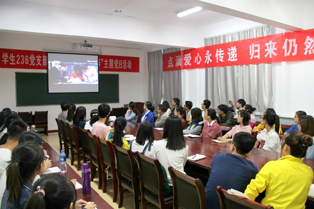 接着,参会人员纷纷结合结合236的事迹,发表了自己观看完专题片后的感受。物理系主任、物理学A支部书记李俊生谈到:“236爱心社始终坚持坚守信仰、关注公益、爱心奉献、失志成才的宗旨,弘扬无私奉献精神,展现了当代老员工风采的坚强堡垒。”电子系主任、员工电子党支部书记崔艳谈到:“236爱心社是公司贯彻十九大精神,落实立德树人根本任务的典范,是所有勇于承担、乐于奉献的人们前进路上的一盏明灯、一面旗帜,236精神也是全校、全省乃至全国应该大力弘扬的时代精神。”原任院团委副书记、国家级教学能手、员工236党支部党员朱肖波说:“我很荣幸能加入236党支部,成为支部+社团融合共建新模式下的优秀党支部的一员,成为236导体工程建设的助力者。”原任院团委副书记、236爱心社第八任社长、共青团山西省十五大代表、236党支部党员张淑彤说:“在236人的共同努力下,中央电视台发现之旅频道聚焦先锋榜栏目播出了《点滴爱心永传递 归来仍然是少年》专题片。这是我们236人心中的一份骄傲。希望接下来的日子里,我们可以不断前行,砥砺奋进,再创辉煌。”236爱心社现任负责人李旭宁说:“遇到236是我大学中最美好的事情,236这个数字似乎有一种神奇的力量,让每一代236人都对它有一种无法割舍的感情。今天的236,倾注了众人的心血,寄予着很多人的梦想”。236爱心社社员王银生说:“从一个宿舍番号,到现在拥有明确骨架的四百多人的大社团,她们用的是一种点滴奉献爱心的执念,正是由于一代代236人经营下,产生了236精神,将每一届社员感染,将点滴爱心顺利传承,创造了这么大的效应,我想这就是236精神的发扬的根本吧!”