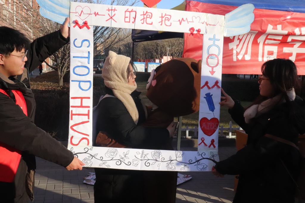 本次活动吸引了众多同学积极参与,寒风中大家一手拿着笔,一手抵着横幅,认真签下自己的名字,并在便利贴上写下自己的美好祝福和期待粘贴在海报上,对艾滋病患者表达最诚挚的祝愿。参与活动的同学们还领取了写有关于预防艾滋病知识的小卡片以及手工制作的象征着艾滋病国际符号的红丝带。