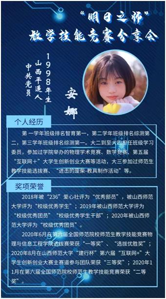 为了充实假期生活,提升对师范类专业竞赛相关知识的了解,1月23日,公司2004班于线上开展了“明日之师”教学技能竞赛分享会。本次分享会由班长王泽辉主持。分享会还特别邀请到了“第六届全国师范院校师范生教学技能竞赛”二等奖获得者——1701班安娜分享个人比赛经验。
