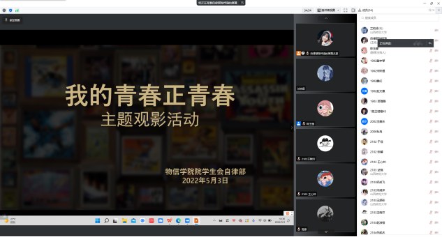 在五四青年节到来之际,为引导公司学子树立正确价值观,增强青少年的社会责任感,加深爱国情怀,公司员工会自律部于5月3日在线上开展“我的青春正青春”主题观影活动。