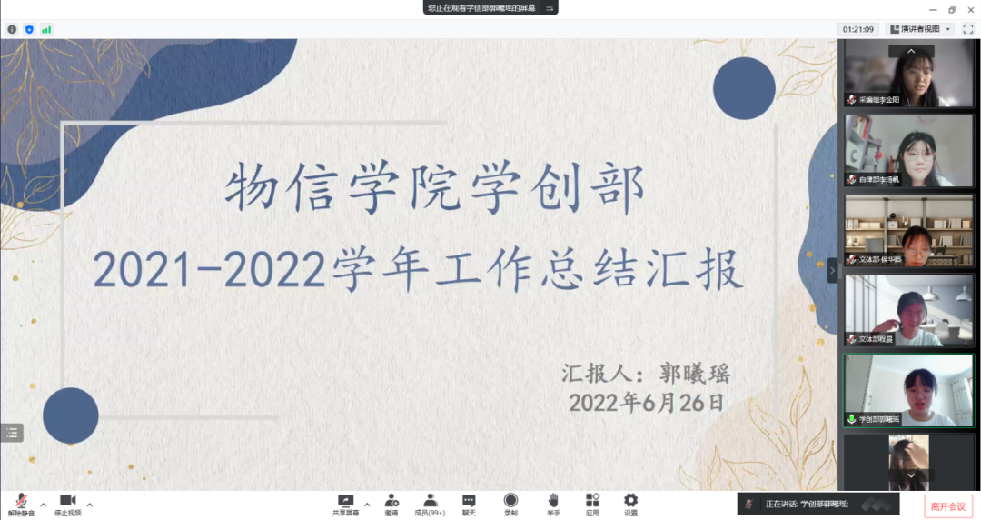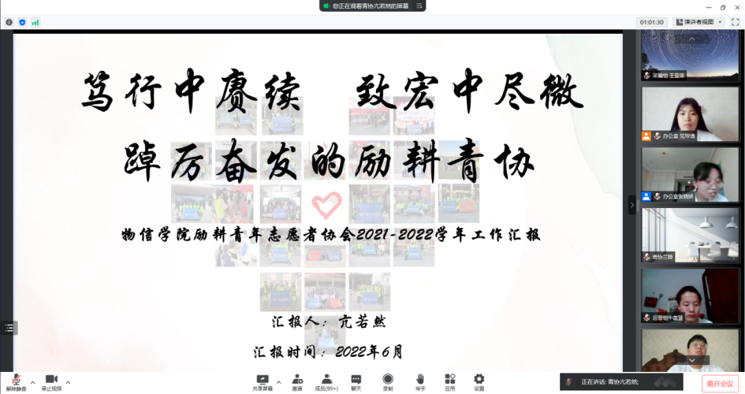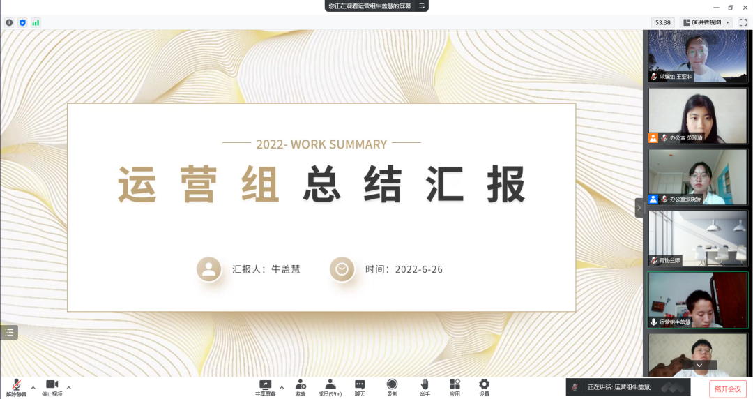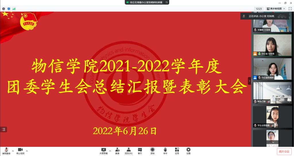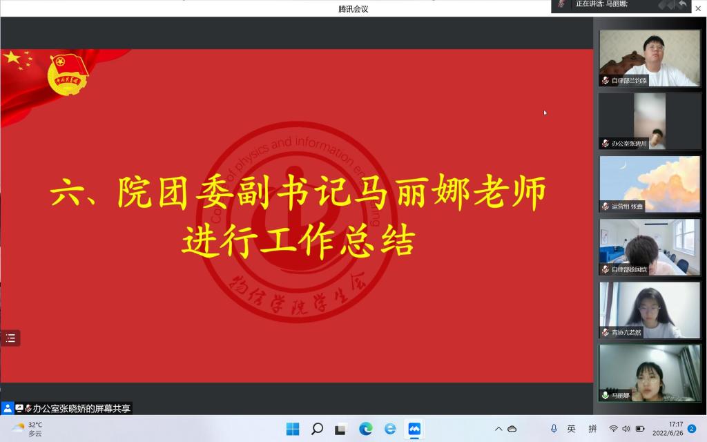 6月26日下午,公司2021-2022学年度团委员工会总结汇报暨表彰大会于线上举行。院团委副书记马丽娜出席会议。院团委员工会主席团成员、各部门负责人及志愿者参加会议,会议由员工会办公室负责人范琼清主持。