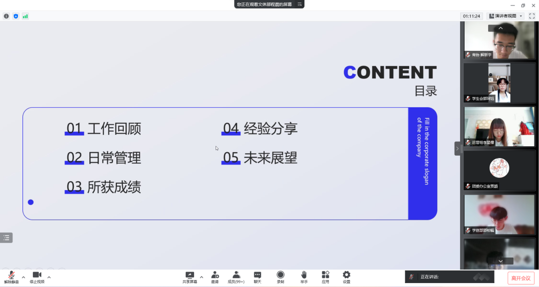 会上,与会人员共同观看了团委员工会一学年的工作集锦视频。随后各部门负责人依次结合PPT和视频,从年度工作总结、存在不足与解决方法、未来工作方向等方面对本部门近一年的工作进行了总结汇报。