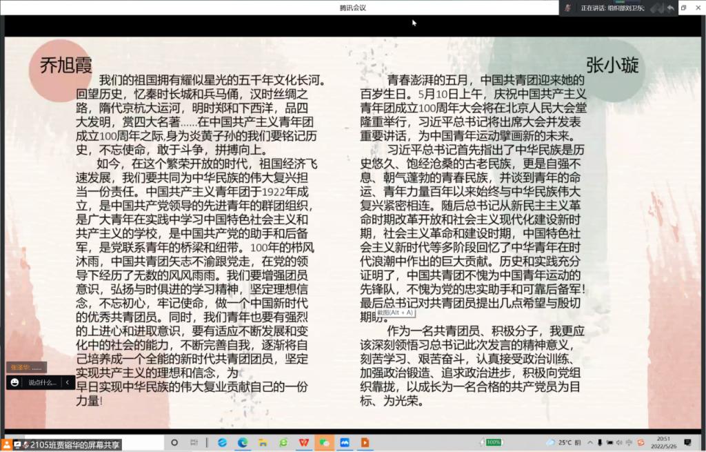 活动中,各班团支书带领同学们学习了习近平总书记在庆祝中国共产主义青年团成立100周年大会上的重要讲话,回顾了中国共产主义青年团自诞生到现在的百年历史。1906班团支书王娜强调:作为一名团员,我们要紧密地团结在以习近平同志为核心的党中央周围,始终牢记、忠实践行习近平总书记对共青团和青年工作的期望与要求,并明确自己所肩负的社会责任。同学们纷纷表示,作为当代青年,应当谨记习近平总书记的教诲,牢固树立共产主义远大理想,自觉担当责任,在我们这一代的新长征路上贡献出自己的青春力量。