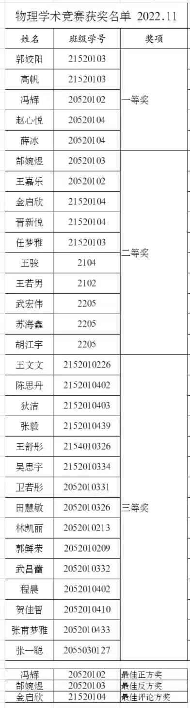 比赛结束后,指导老师从理论分析的问题、误差改进方法、PPT展示、三方活动论述中的问题等方面对选手们的表现进行细致点评,并对每位选手提出了针对性建议,评出了获奖名单。以下是物理学术竞赛决赛的获奖名单。