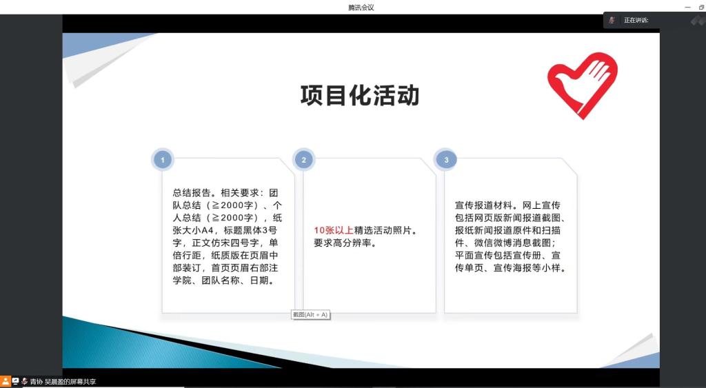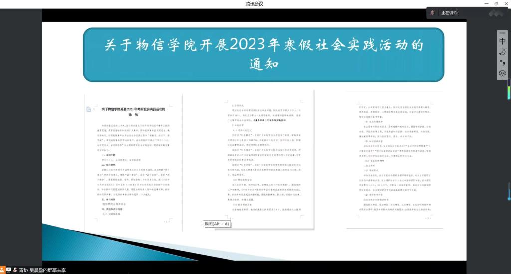 培训中,吴晨盈首先为大家介绍了本次寒假社会实践的基本内容,鼓励同学们在做好个人防护的同时线上开展相关实践活动,随后她分别解读了项目化和自主实践调研的活动开展内容及材料准备。接着,她引出三个案例,向大家强调在活动开展中人身安全的重要性,并针对外出实践活动时可能出现的突发情况提出一系列解决措施。同时她还提出,各队伍应该做好活动前准备,鼓励大家开展线上活动,线下开展活动时一定要做好个人防护同时要向指导老师进行安全报备,要及时在相应媒体平台投稿,进行适当宣传,保证整个实践活动合理有序推进。最后,院青协主席王泽辉为大家介绍了本次寒假社会实践最终的考核标准,对各小队提出的问题进行了解答,提醒大家要按时、保质提交相关材料,同时他预祝各支队伍能够安全、圆满地完成本次社会实践。