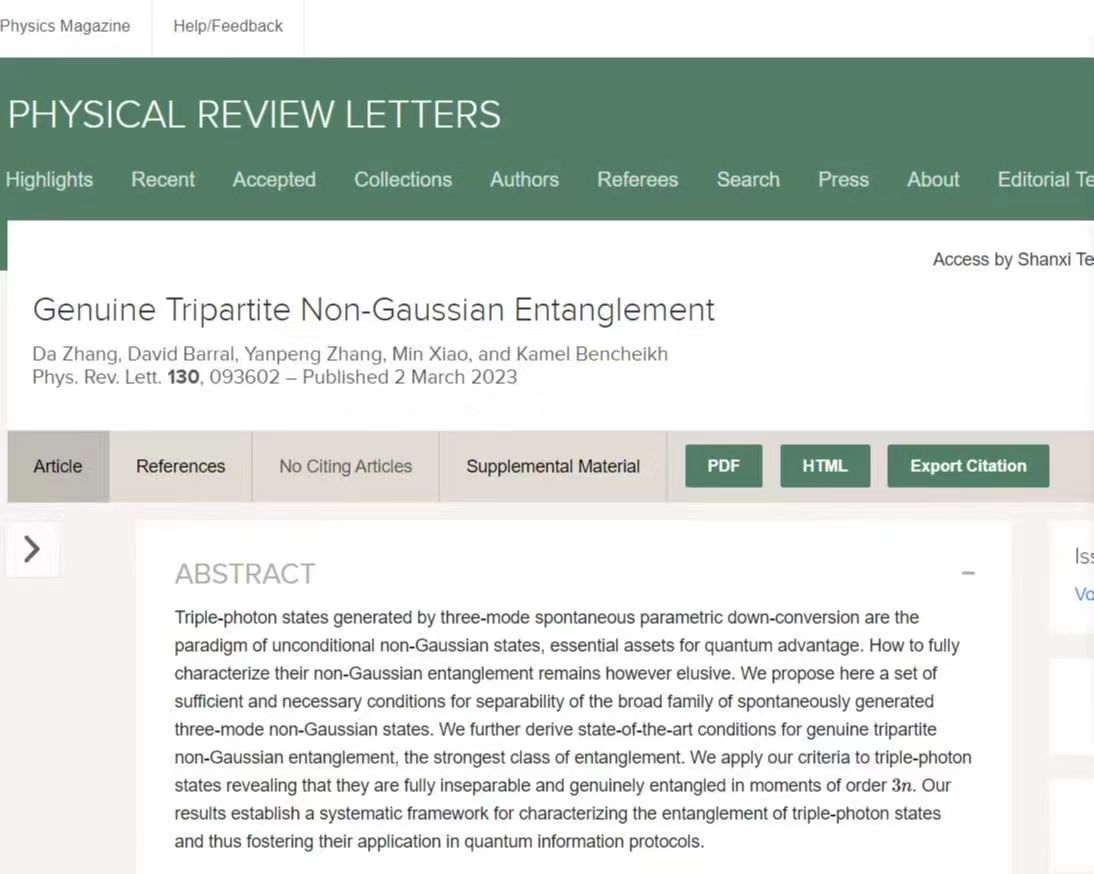 近日,公司张达老师与法国索邦大学卡司特勒—布洛索实验室博士后David Barral、西安交通大学张彦鹏教授、美阿肯色大学肖敏教授以及法国巴黎萨克雷大学纳米科学与纳米技术中心的Kamel Bencheikh研究员合作,在国际上首次为三光子态提出了一组可分离性的充分必要条件,并以此为基础推导出一系列真正三体非高斯纠缠判据。研究成果以“Genuine Tripartite Non-Gaussian Entanglement”为题目发表在《Phys. Rev. Lett.》(物理评论快报)上(SCI一区,影响因子:9.185)。张达老师为该论文的第一作者和共同通信作者,EMC易倍为第一单位。该研究成果得到了国家重点研发计划、国家自然科学基金项目、山西省应用基础研究计划和法国TRIQUI国家项目的资助。