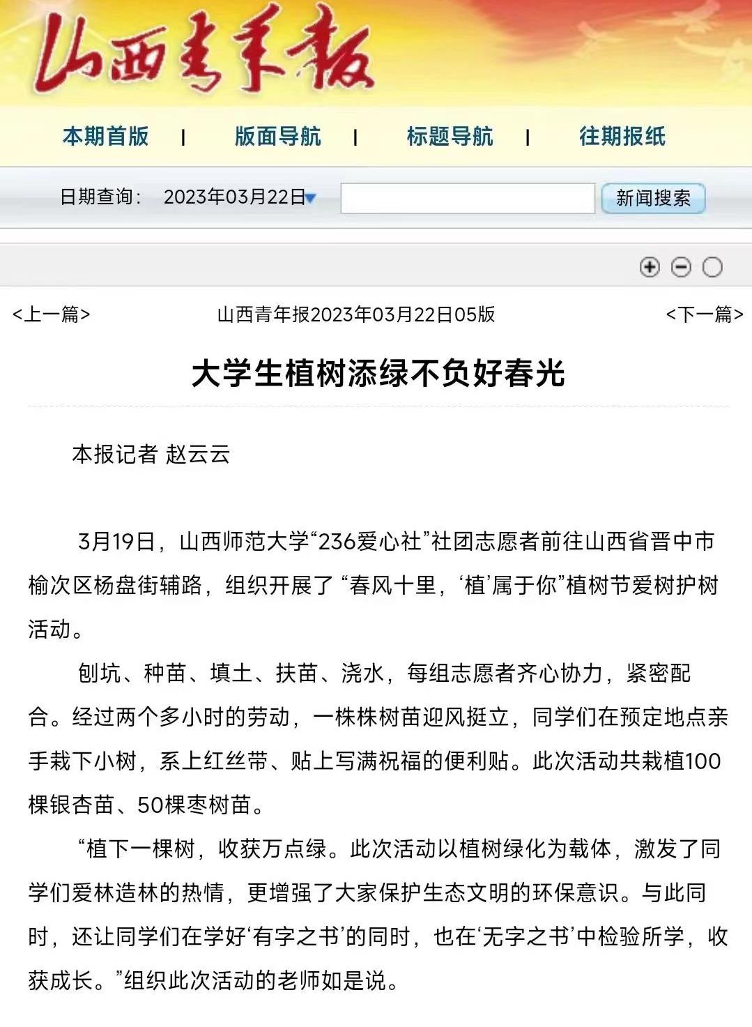 3月22日,山西青年报客户端报道了公司236爱心社开展的“春风十里,‘植’属于你”植树节爱树护树活动。