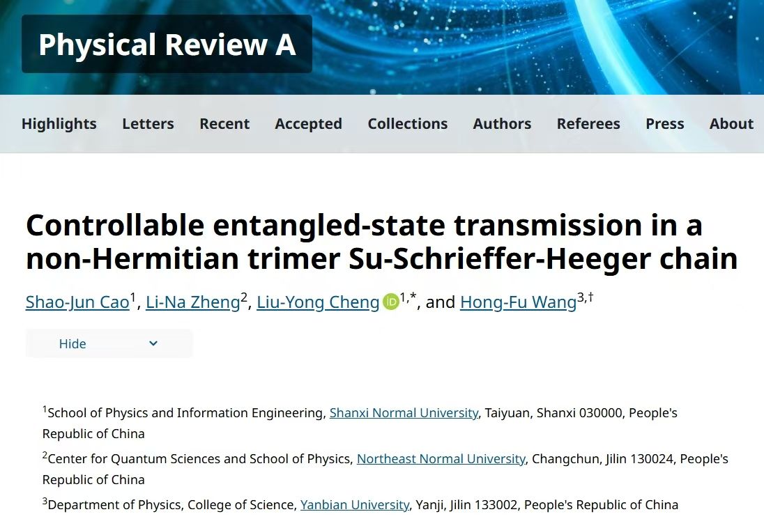 这一研究成果以“Controllable entangled-state transmission in a non-Hermitian trimer Su-Schrieffer-Heeger chain”为题,发表在Physical Review A[Phys.Rev.A 110,062409(2024)]。这是量子信息团队继在一维超导磁通量子比特链中实现单量子态的可控传输[Phys.Rev.A 102,012606(2020)],以及一维超导谐振器链中实现量子纠缠态的可控传输[Chin.Phys.B31,020305(2022),Editors’suggestions编辑推荐] 后,在拓扑量子体系中实现量子态转移的又一工作。公司2022级硕士研究生曹劭君是论文第一作者,程留永副教授和延边大学的王洪福教授为通讯作者,东北师范大学物理公司博士生郑黎娜参与了计算和分析。该工作得到了国家自然科学基金、山西省基础研究计划和吉林省自然科学基金等项目的资助。