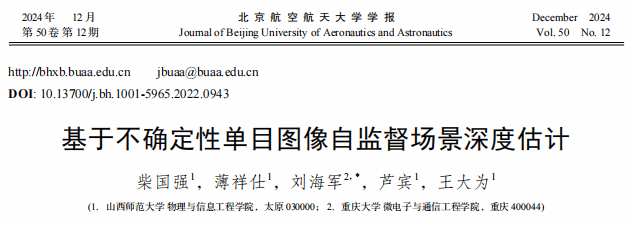 这一研究成果以“基于不确定性单目图像自监督场景深度估计”为题发表在北京航空航天大学学报[2024,50(12)]。公司柴国强副教授为第一作者,重庆大学刘海军副教授为通讯作者。该工作得到了国家自然科学基金、山西省基础研究计划等项目的资助。