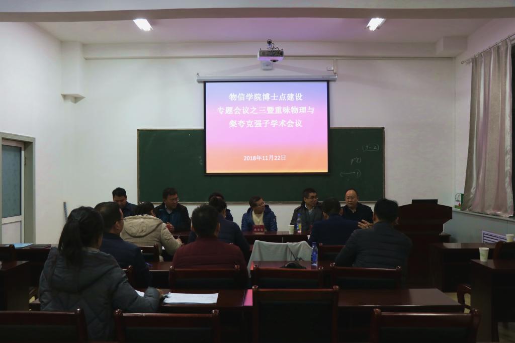 为进一步推进公司物理团队建设与发展,全面提升公司物理学研究水平,更好地推进公司博士点建设工作。公司于2018年11月21日—24日召开了博士点建设专题会议之三暨重味物理与粲夸克强子学术会议,其中包括学科方向论证、建设与交流的学术专题会议、博士点建设推进交流会、国家基金申报及高被引文章发表撰写经验交流会、多尺度学术前沿探讨、交流会。同时,公司特邀中国科公司(高能物理研究所/大学)教授吕才典、中国科公司(高能物理研究所/大学)教授李海波、湖南师范大学教授余洪伟、中国台湾清华大学教授耿朝强为公司师生做了4场学术报告。