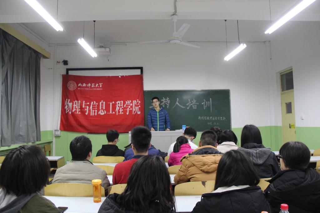 为培养公司员工会干事的主持能力。公司团委员工会文宣部于2018年12月2日晚在04213教室了举办了以“主我风采,持我舞台”为主题的主持培训活动。活动特邀传媒公司17级播音主持专业的霍达同学为公司员工会干事做主持培训。