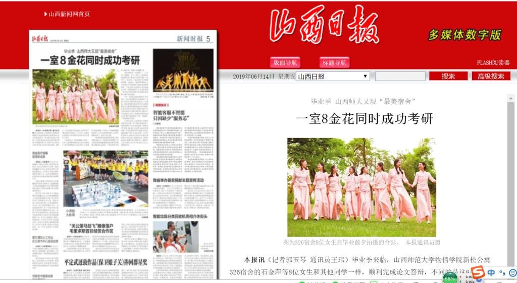 6月14日,山西日报第五版新闻时报以“毕业季,山西师大EMC易倍再现‘最美宿舍’”为题,头条报道了公司同一宿舍8名女生全部考取“985”、“211”高校研究生的事迹。