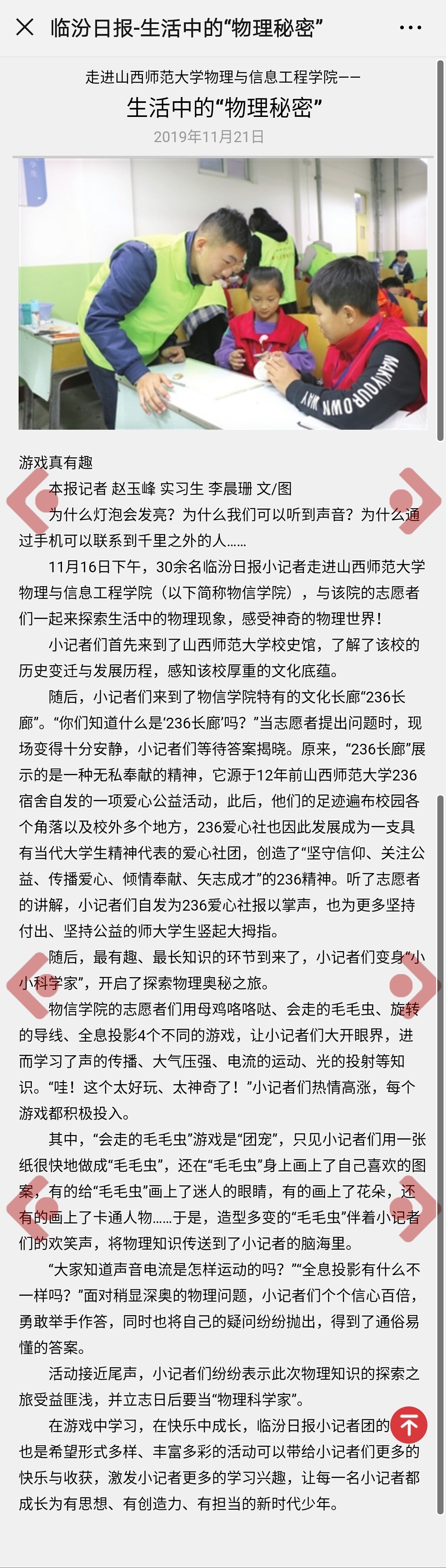 临汾日报报道公司志愿者带领临汾日报小记者走进“物理实验”活动