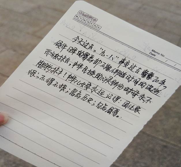 活动开始,武佳同学组织各宿舍同学们观看了“九一八事变”专题纪录片,回顾了“九一八事变”的发生过程,带领同学们一起悼念了在日本帝国主义侵华期间惨遭杀戮的死难同胞,缅怀了抗日战争中牺牲的英烈和为之贡献的人们。同学们纷纷表达了自己对于“九一八事变”无辜受害者的深切悼念,并表示在今后的学习生活中一定要牢记历史,永不忘国耻,用汗水践行铮铮誓言。