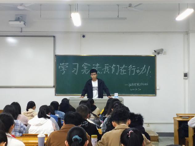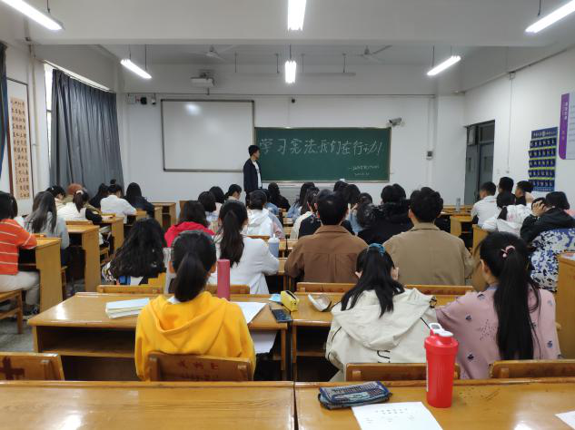 活动中,吴培清同学为大家详细讲解了《中华人民共和国宪法》的诞生与五次修订历史,并就宪法作用与宪法意义作出了进一步的诠释;李美琴同学为大家普及了国家宪法日的相关知识,细致阐述了其设立的目的与意义;程晓敏同学结合真实案例与同学们深入探讨了宪法在维护社会稳定与国家长治久安中起到的重要作用。同学们纷纷表示,河清海晏的盛世,离不开坚实的宪法保障,维护宪法、尊崇宪法就是保护我们安定幸福的国与家。