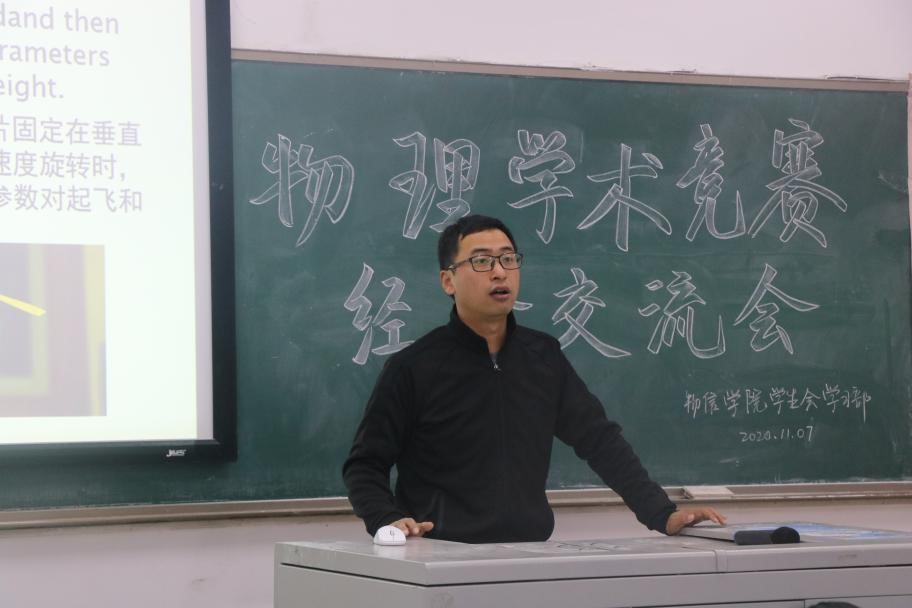 活动中,程留永老师介绍了物理学术竞赛的大致内容和意义;秦子开就比赛规则、时间、题目选择及题目解读进行了经验分享;冯宇曦对团队合作的重要性、实验仪器的选择等方面进行了介绍,并提出了一些相关建议。