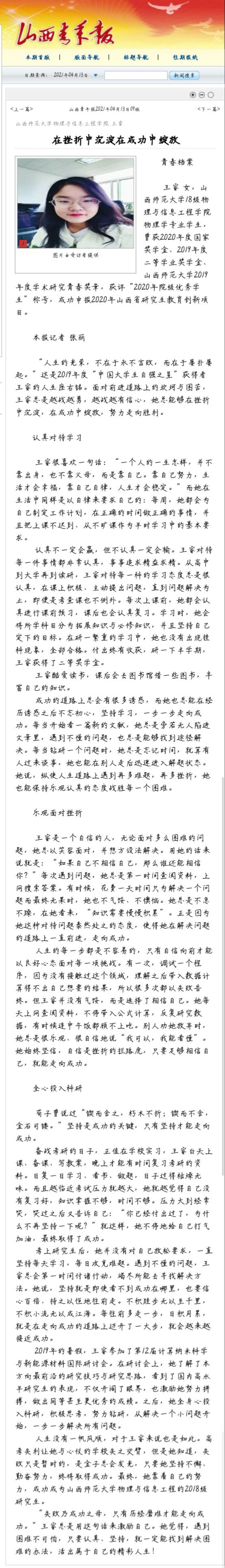 公司18级物理学专业研究生,在校期间曾获2020年度国家奖学金、2019年度二等学业奖学金、EMC易倍2019年度学术研究青春奖章,获评“2020年院级优秀员工”称号,成功申报2020年山西省研究生教育创新项目。(文/1902班 刘晓璇)
