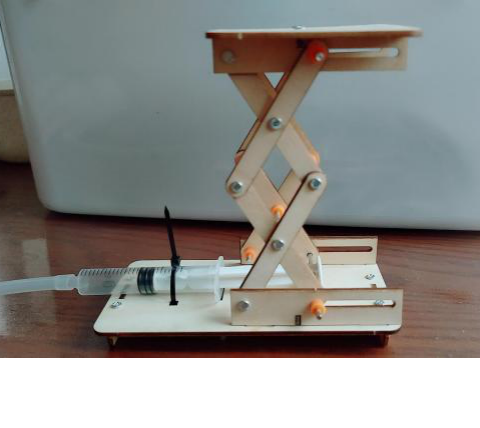 首先是准备所需材料,然后制作用来托举物体的上层平台,接下来制作用于支撑平台的托举架和传动装置,接下来要把架子和下面当做基座的木板进行连接,然后连接用来摆放物品的上层平台,并把一个注射器针筒固定在基座上,把注射器的推动活塞的尾部和托举架相连接。原理:通过液压做动力,利用平行四边形结构实现升降的。以液体作为工作介质,利用液体的压力传递动力。使用液体传递动力具有柔性传动的优势,管道可折弯,并且容易实现较大的传动比。(文/2003班 郭曦瑶 摄/美编部)