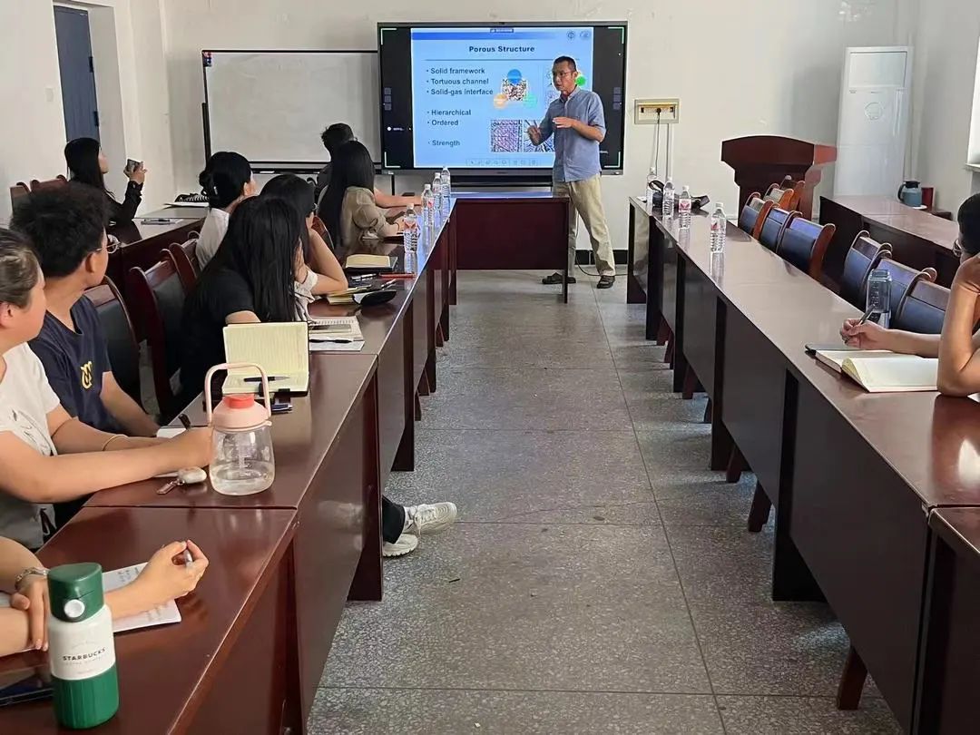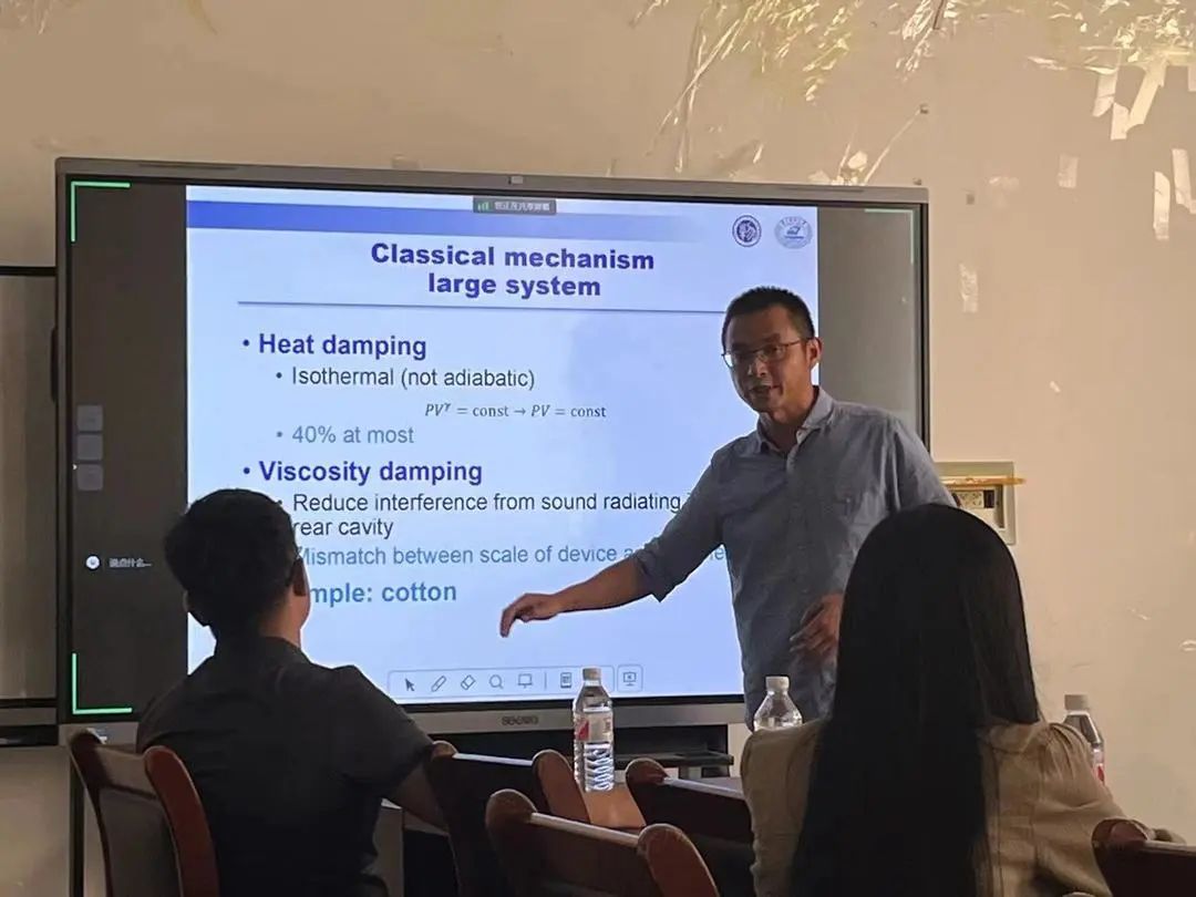 报告会上,钱教授首先介绍了高品质、小型化的声学器件在人机交互领域的重要地位,提出提升微型扬声器的低频性能是非常关键的科学问题。以此为研究背景,发现在微型扬声器后腔中填充分子筛是调控声波、提升器件音质的有效途径。钱教授通过等效电路理论和热动力学理论,定量分析微型扬声器力顺与分子筛填充体积的线性关系,其斜率用于衡量力顺的本征增强能力,为研究多孔材料的气体吸脱附动力学、多孔材料与分子的微观作用机理提供了新颖的评价方法,而且为设计高品质声学增强材料提供了可行的实验方案。