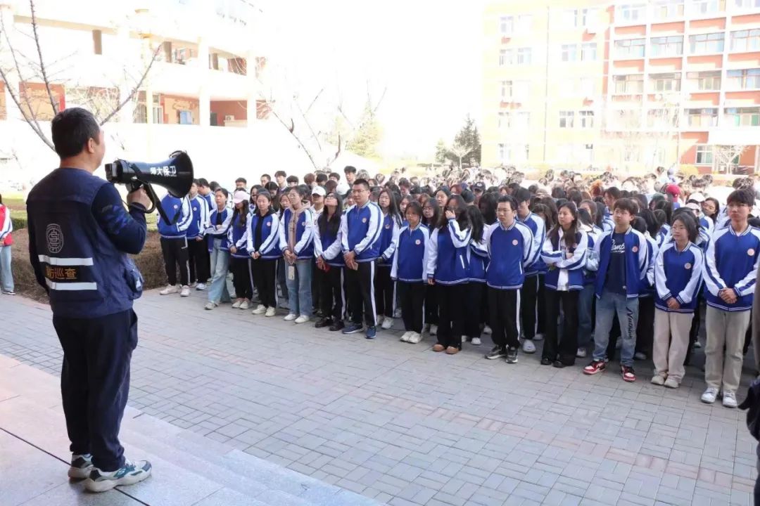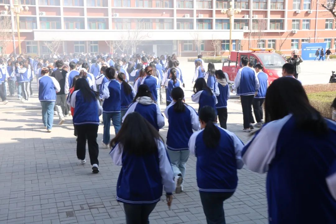 活动伊始,同学们在五号楼前准时集合。清点人数后,自律部志愿者带领各班到指定教室准备演练,同时讲解了演练流程和注意事项。随后,“嘟--嘟--”的哨声响起后,同学们立即从各自的教室紧急撤离,从就近楼梯以体前曲臂、弓背、捂口鼻的姿势,有序疏散出教学楼撤离到书香广场。