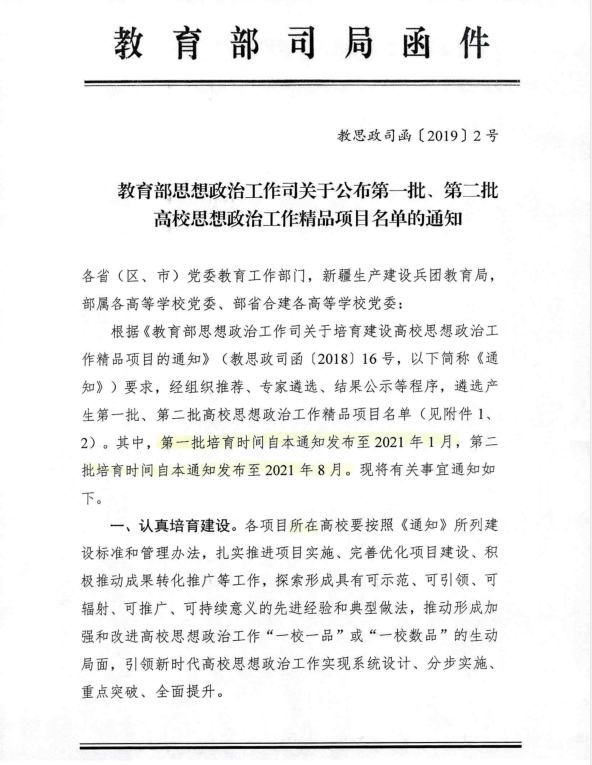 近日,教育部思想政治工作司发布了《关于公布第一批、第二批高校思想政治工作精品项目名单的通知》(教思政司函〔2019〕2号)。在公司党委领导的亲切关怀和公司党委宣传部的有力指导下,公司申报的《“236爱的足迹”文化协同育人工作品牌》文化育人项目,经组织推荐、专家遴选等程序,成功入选教育部第二批高校思想政治工作精品项目(全国共有100个),培育时间为2019年1月—2021年8月,同时获得教育部10万元工作经费支持。这次入选,是公司乃至公司近年来在思想政治工作精品项目方面的重大突破,有力的推动了公司乃至公司的思想政治工作项目化、精品化建设。