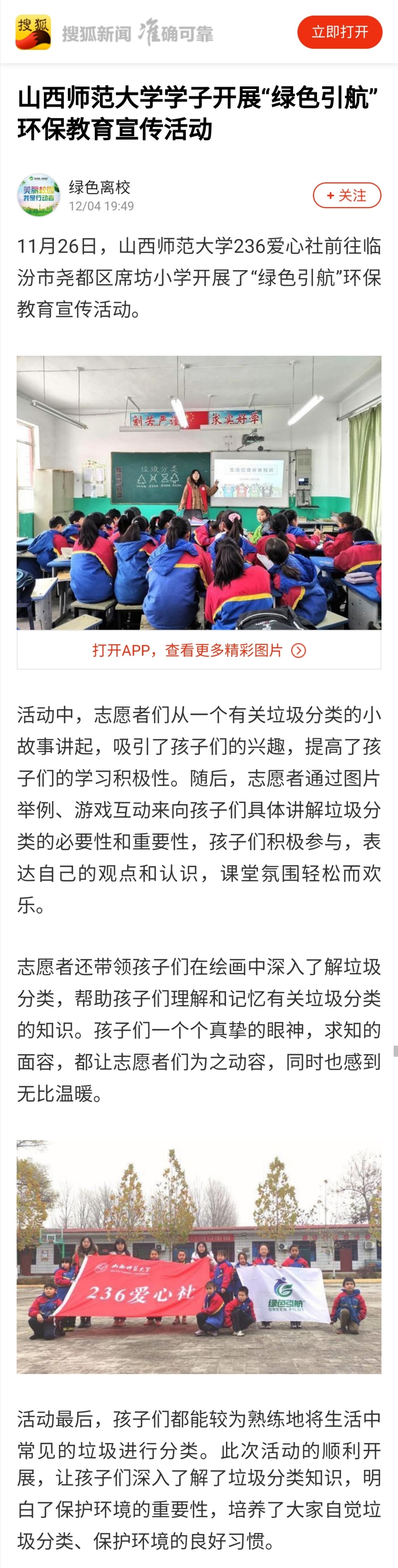 12月4日,搜狐新闻客户端以“EMC易倍学子开展‘绿色引航’环保教育宣传活动”为题报道了公司236爱心社“绿色引航”环保教育宣传活动。