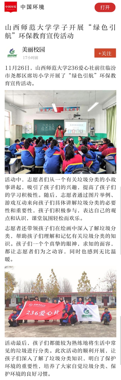 中国环境客户端报道公司236爱心社“绿色引航”环保教育宣传活动