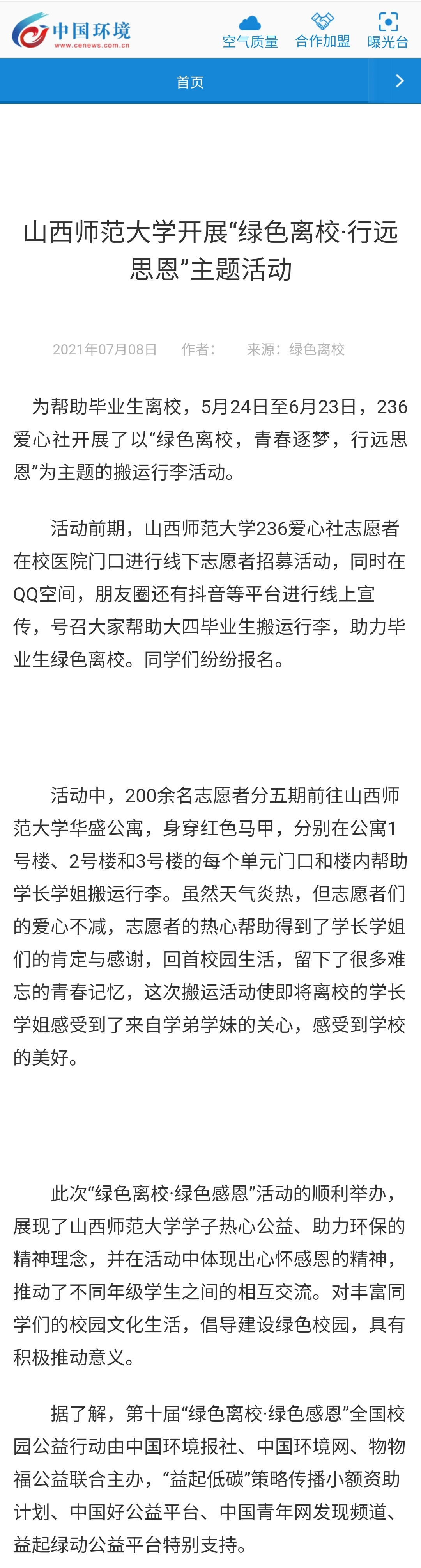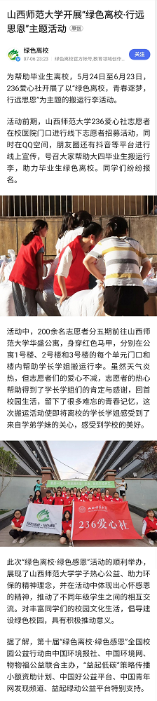 绿色离校官方账号、中国环境客户端、中国环境网分别于7月6日、7月7日、7月8日以“EMC易倍开展‘绿色离校·行远思恩’主题活动”为题报道了公司236爱心社开展的以“青春逐梦,行远思恩”为主题的搬运行李活动。