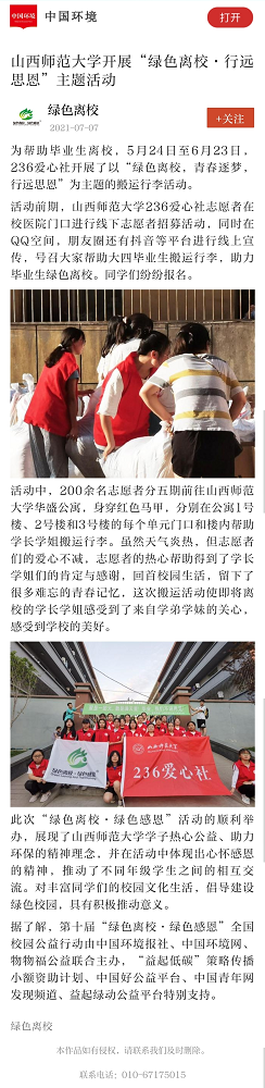 绿色离校官方账号、中国环境客户端、中国环境网报道公司236爱心社“青春逐梦,行远思恩”主题活动