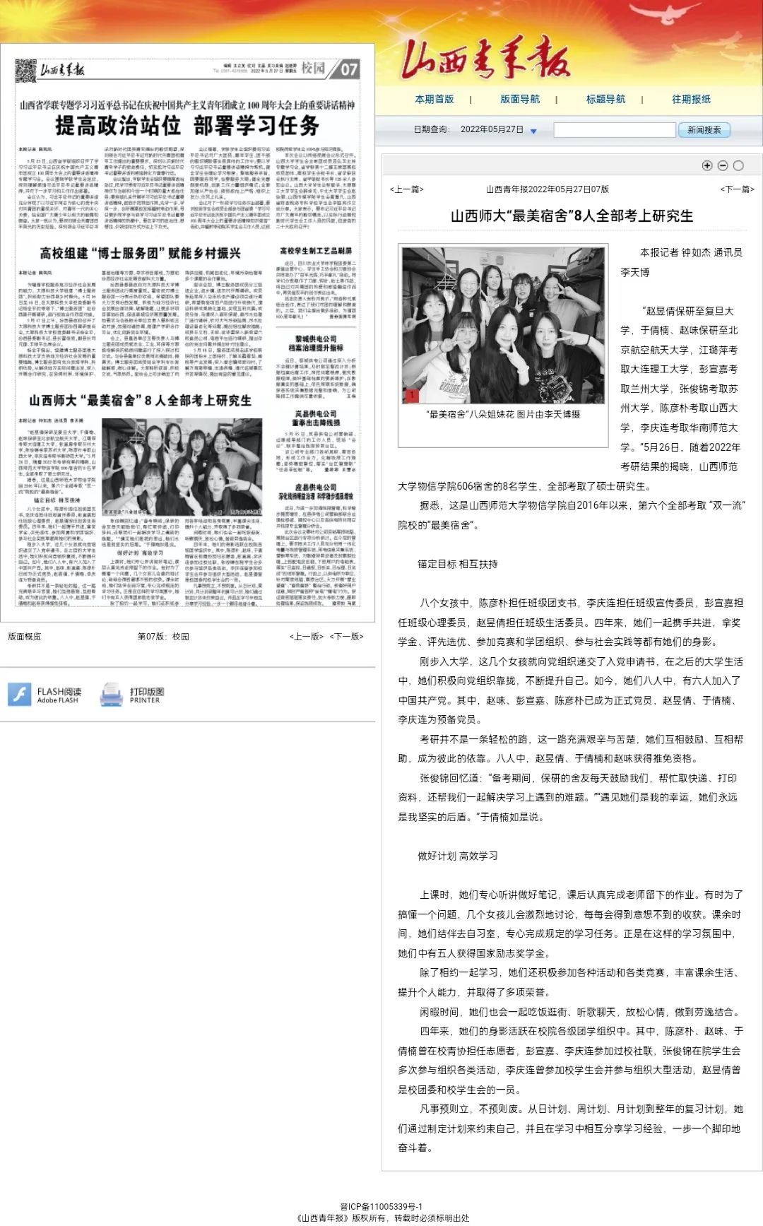 5月27日,山西青年报以“山西师大‘最美宿舍’8人全部考上研究生”为题,报道了公司原华盛5#606宿舍8名学子全部考取“双一流”院校研究生的新闻。